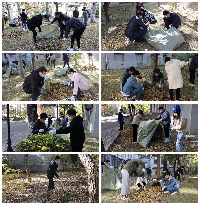 在主楼侧后的草坪中,师生们对落叶进行了清扫。大家分工协作,分组包干。在劳动中,同学们通过向物业同志们学习,很快掌握了劳动技巧,利用专用工具,高效的将落叶进行了集中和收集。看着劳动的收获,大家觉得深秋的校园愈发美丽。通过劳动,大家深刻感觉到,学校保安、食堂和保洁等工作人员,为大家的科研生活提供了大量的保障服务工作,他们不辞辛劳、起早贪黑,大家更应该自觉维护校园环境,自觉增强爱校荣校的使命感,共同维护美好的校园环境。