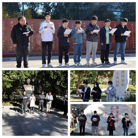 在东门、中心花园等地,师生们依次参观了理工赋石、徐特立雕像、“团结勤奋 求实创新”校风石以及延安石,17名师生党员代表诵读了《理工赋》、徐特立生平等相关石刻碑文,学习了伟大的延安精神,回顾了学校的办学历史和校址变迁。特别是80余年来,学校始终听党话、跟党走,坚持为党育人、为国育才,走出的“红色育人路”和“创新发展路”深深的感染了每一位师生党员。