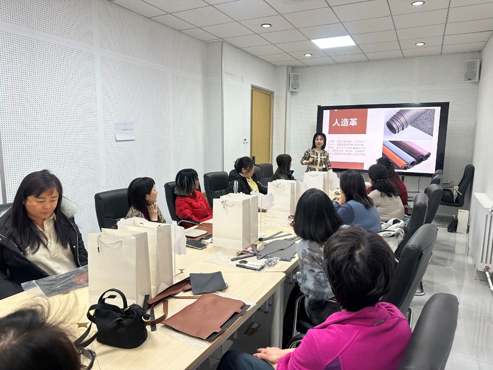 活动现场布置温馨,学院为大家准备了优质皮革、缝线、丝巾配饰等全套材料。在专业指导下,老师们从穿针、压线到拼接、塑形,一步步认真操作,将零散皮料精心缝制为简约优雅的水桶包。大家相互切磋、默契协作,指尖穿梭间尽显专注与巧思,现场洋溢着轻松愉悦、温馨和睦的美好氛围。